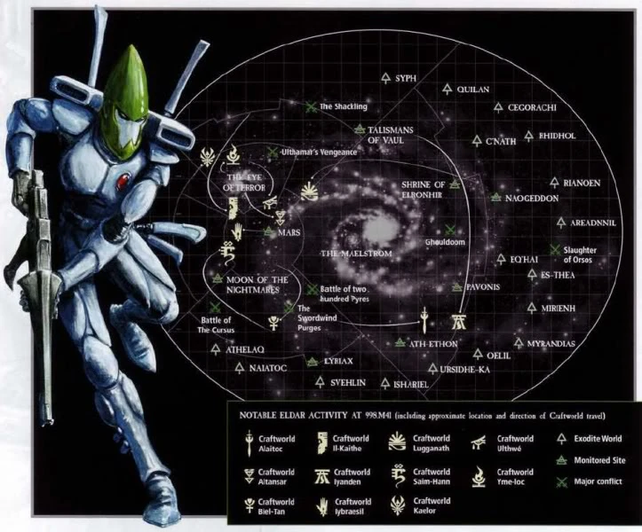 - La Gran Fisura: Acosada por inmensas tormentas de disformidad y múltiples eventos cataclísmicos, la galaxia se estremece. Como una fisura en el tapiz de la realidad, una rasgón recorre el espacio real, creando una brecha desde la cual el inmaterium se desborda. La Gran Grieta se extiende desde la Anomalía Hadex en la Franja Este hasta el sistema más lejano del Segmentum Obscurus en el noroeste galáctico. Una oscuridad envuelve la galaxia, y cada mundo astronave sufre daños por las tormentas y las invasiones daemonícas que siguen. A medida que el cataclismo inicial disminuye, los Asuryani se comunican unos con otros, para revisar los supervivientes; a pesar de las dificultades experimentadas por cada uno de los mundos astronave, incluso los mundos astronave más oscuros, como el oculto MeudWyaid y el sigiloso Mymeara, emiten comunicados. Solo dos de los mundos astronave conocidos no responden, sus destinos se desconocen.
