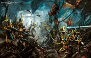 - Aumentan las tormentas disformes: La galaxia se inunda a medida que las tormentas de disformidad aumentan de intensidad y se extienden a través de las estrellas. Los Aeldari sintonizados psíquicamente puede sentir la creciente presión, mientras que los videntes de su pueblo escuchan los sonidos antinaturales de la perdición. A pesar de la sabiduría, la habilidad y la previsión de los Asuryani, y el poder de los ejércitos de la Humanidad, cae el eje Imperial del planeta de Cadia.