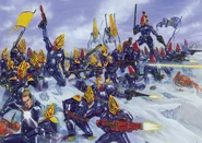 - La Marea Roja: La sexta oleada de la Cruzada de Sangre apuñala al oeste galáctico, sus fuerzas se materializan sobre planetas para causar estragos. En el planeta Imperial de Upsilon, uno de los bastiones exteriores de las defensas de Terra, los ejércitos de Khorne son detenidos. Pero, no son las fortalezas defensivas o los muros de la Humanidad los que finalmente impiden la matanza, sino los Jinetes Salvajes de Saim-Hann. No menos de cinco clanes enteros descienden al vórtice. Las oleadas de motos a reacción surcan entre los restos de los búnkers y las torretas destrozadas para arrojar un fuego devastador sobre los Desangradores allí reunidos antes de despegar otra vez a toda velocidad. Repletos de rabia, la hostigada hueste de daemons carga una y otra vez, pero no logran alcanzar a sus veloces enemigos. A medida que los daemons se marchan frustrados para encontrar una presa más fácil, los Asuryani también se dispersan, sin decir ni una palabra a los atónitos supervivientes humanos.