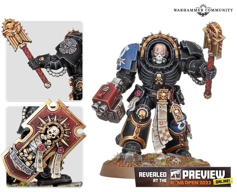 La servoarmadura del Capellán es de color negro azabache mate, con un cráneo blanco pintado en la hombrera derecha. El Capellán de la Primera Compañía está equipado con una armadura de Exterminador de color negro, tal y como indica el Codex Astartes, cuya hombrera derecha conserva el color de su Capítulo. De todos los Marines Espaciales de un Capítulo, los Capellanes son los guerreros más fervorosos y valientes. A lo largo de los siglos, han sido grabadas en sus antiquísimas armaduras todo tipo de letanías e insignias honoríficas, que conmemoran sus numerosos actos de heroísmo.