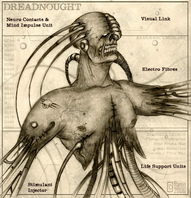 Se dice que algunos Dreadnoughts tienen incluso decenas de miles de años y datan de la Gran Cruzada, cuando el Emperador todavía caminaba entre los suyos. La construcción de un Dreadnought es algo poco común debido a que los conocimientos arcanos necesarios para ello se fueron convirtiendo en mitología ritualizada, así que cada Dreadnought de un Capítulo es una reliquia valiosísima.