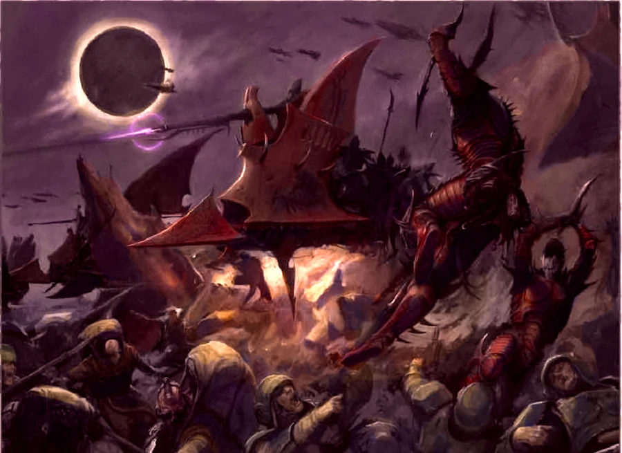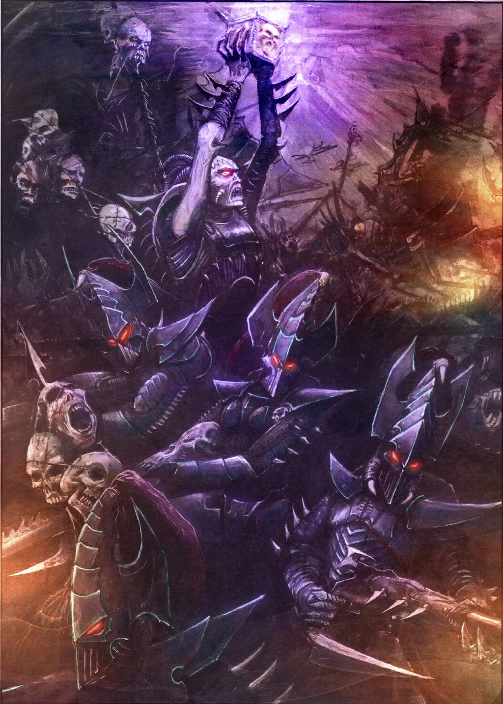- Se abre el Gran Ojo (995999.M41): La 13ª Cruzada Negra surge del Ojo del Terror y los ejércitos del Imperio se mueven para oponérsele. Los Drukhari descienden sobre el espacio real a miles para aprovecharse del caos, pero otra batalla se libra en la Ciudad Siniestra. A través de canales arcanos, Lady Malys ha conocido la situación de la Puerta de Khaine. Temiendo que Vect tenga pensado abrirla y sumergir a sus rivales en Daemons, la Arconte de la Lengua Envenenada activa recursos por toda Commorragh. Oleadas de energía empírica golpean la Ciudad Siniestra desde el Ojo del Terror, colapsando sub-reinos y rompiendo portales. Bandas de cabalitas, brujas y arlequines leales a Malys o Vect se enzarzan en escaramuzas en la Ciudad inferior, sin darse cuenta de lo irónico que resulta que ambas facciones quieran lograr lo mismo. Entretanto, en una cámara llena de locura retorcida, se expanden las grietas por la Puerta de Khaine y los Nulificadores enjaulados empiezan a gritar...