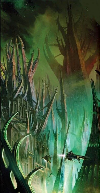 El reino de Commorragh se expandió imparable mientras la riqueza fluyó a través de sus fronteras. Con cada nueva expansión se extendió hacia el vacío, consumiendo otras ciudades portuarias, haciendas privadas y sub-reinos. Commorragh se hizo cada vez más grande e impresionante a medida que se alimentaba de los recursos saqueados. Sin ser vistos, los señores diletantes que gobernaban las agujas y los antros de placer de Commorragh crecieron en estatus junto a su ciudad adoptiva, iniciando a más y más Aeldari en sus sombríos credos.