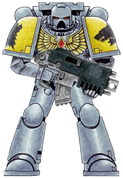 Schéma des couleurs pré-hérésie de la Légion Space Wolves tel qu'affiché par un légionnaire Space Wolf portant une armure assistée Mark II Crusade.