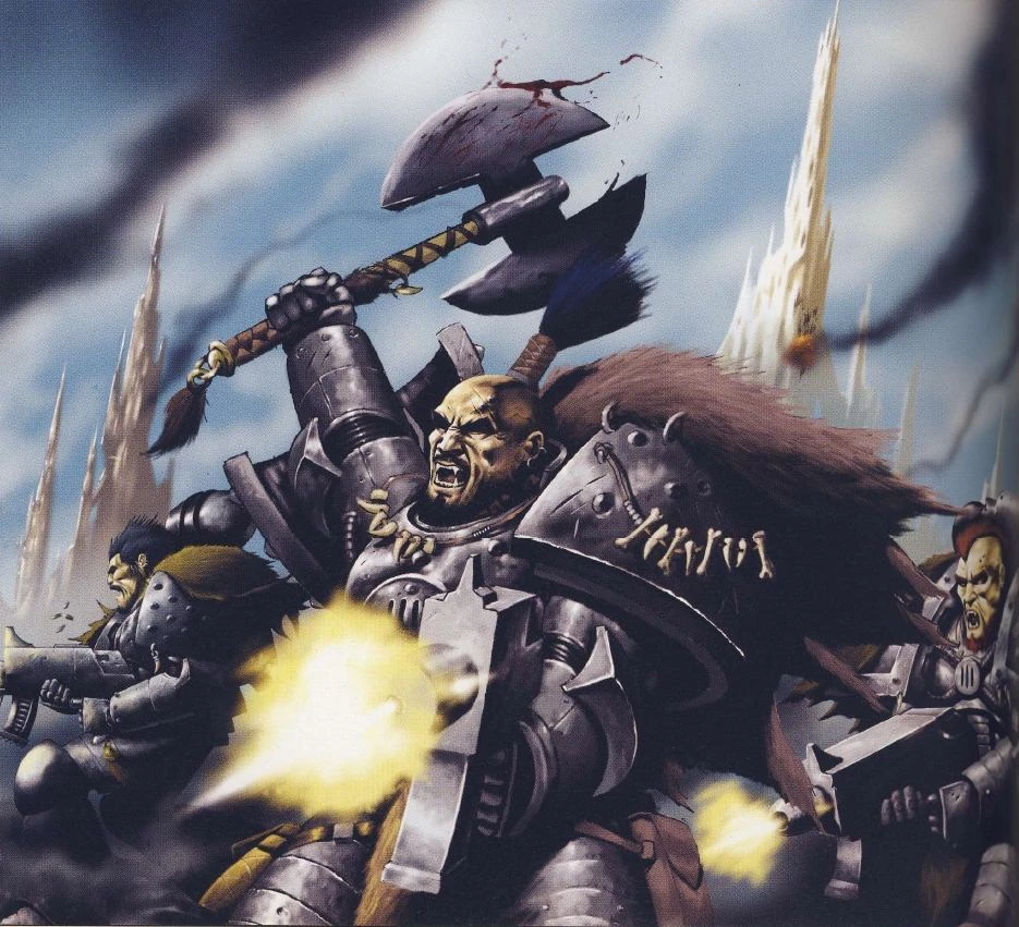 "Ils sont les Fils de Fenris, endurcis dans la forge de leur monde rude, avides de bataille et d'honneur. Ce sont les guerriers gris, cendrés comme le loup, dont la plus grande joie est d'entendre la clameur de l'acier au milieu du vacarme de la guerre."