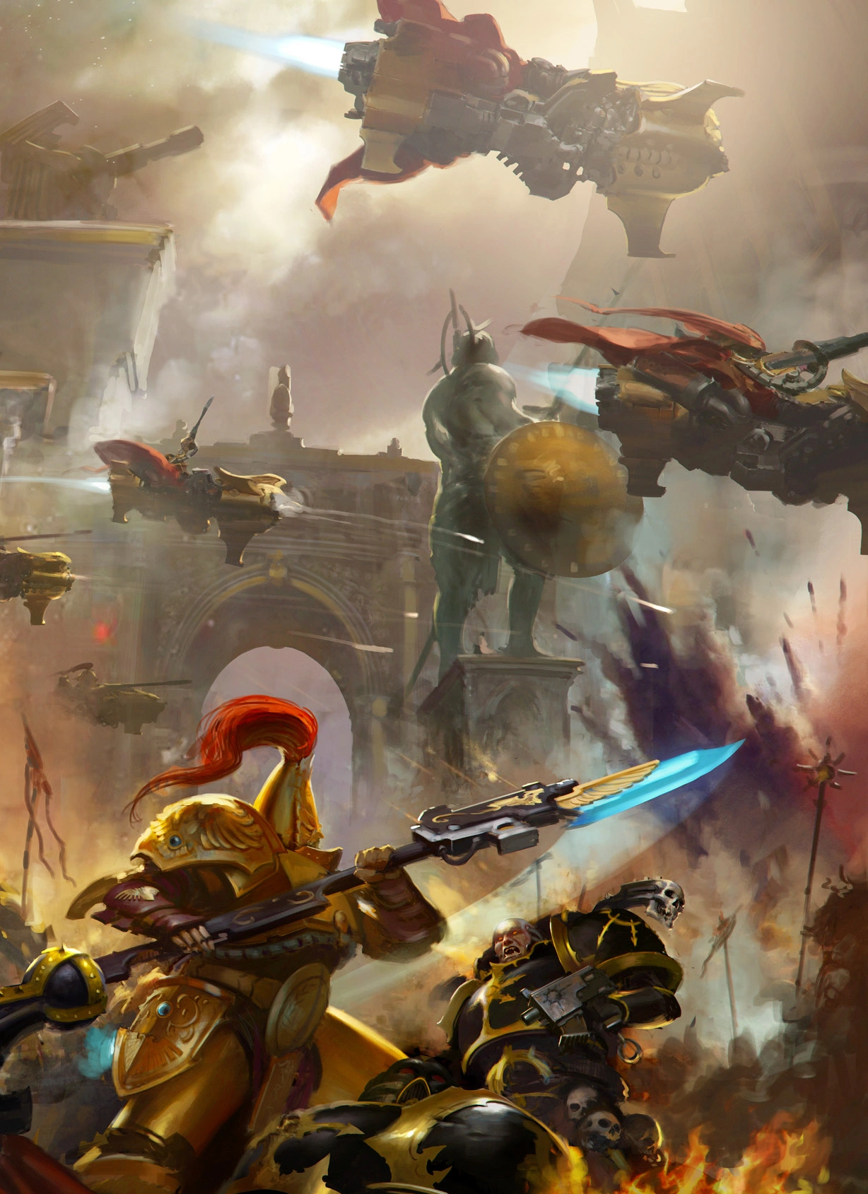 - Bitwa pod Lwią Bramą. Zaraz po powrocie Guillimana na Terrę falę energii z Wielkiej Rozpadliny (ang. Great Rift) rozlały się po całym Systemie Solar. Dzierżąc swe płonące herby horda Deamonów Khorne'a przedziera się do rzeczywistości by zaatakować samą Terrę. Pomimo, że jest to koszmarny scenariusz dla Adeptus Custodes zarządzają oni swoje Protokoły Katastrofy z niezachwianym spokojem i pewnością siebie. Wyruszając by spotkać się z atakującymi przy boku Ultramarines i pokaźnego kontyngentu Sióstr Ciszy, Custodes skutecznie odpierają próbę zniszczenia Imperium przez Krwawego Boga jednym ciosem. Zwycięstwo jest okupione ogromnymi stratami, ale jakby nie było jest to zwycięstwo. Po bitwie Valoris i Guilliman szybko dochodzą do porozumienia. Rola Adeptus Custodes musi się zmienić ponieważ nie mogą dłużej efektywnie bronić Złotego Tronu z murów obronnych pałacu.