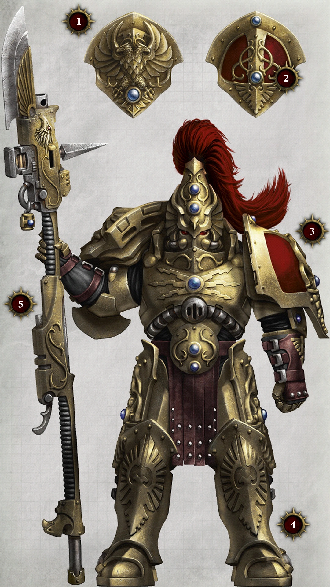 Jeżeli prawdą jest fakt, iż Kosmiczni Marines są synami ich Prymarchów, to Adeptus Custodes są potomkami samego Imperatora. Jego potęga przenika każdego z nich, jego błogosławieństwa zsyłane na nich są tak potężne, że mogą ochronić ich od zarówno obrażeniami fizycznymi, jak i psychicznymi. Świetność Władcy Ludzkości płynie w ich żyłach, płonie w ich oczach oraz emanuje w powietrzu gdy są w pobliżu, aby każdy pełen wiary wojownik instynktownie czuł respekt oraz strach przed obliczem tych półbogów wojny.