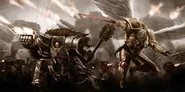 W Imperialnych dokumentach zapisano też, że Prymarcha natychmiast rozpoznał władcę i padł na kolana przysięgając mu posłuszeństwo. Imperator pomógł synowi powstać i razem spojrzeli na morze ludzkich twarzy, zaskoczonych, ale i dumnych - twarzy ludzi silnych i prawych. Tak pod gorącym słońcem Baala narodziły się Krwawe Anioły.
