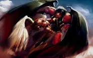 Gdy Horus i Sanguinius spotkali się na mostku, zdrajca zaproponował dowódcy Aniołów, aby przeszedł na jego stronę. Ten odmówił, więc oszalały Mitrz Wojny zapowiedział mu, że jego śmierć będzie najbardziej bolesna i przerażająca ze wszystkich tych którzy sprzeciwili się Chaosowi. Ranny i słaby po bitwach na Ziemi Sanguinius nie stanowił godnego przeciwnika dla będącego u szczytu swej mrocznej potęgi Horusa. Niektóre Anioły wierzą jednak, że podczas walki Patriarcha zdołał otworzyć małą dziurę w zbroi arcyzdrajcy, dzięki której Imperator był w stanie pokonać zbuntowanego syna. Czyn Horusa i jego reperkusje do tej pory dręczą Anioły, ścigane poprzez czas przez psychiczny szok jakiego doznał ich genetyczny ojciec.
