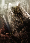 Starożytny szkic Upamiętniacza ze Speculum Historiale Carpiniusa przedstawiający Prymarchę Sanguiniusa podczas Wielkiej Krucjaty.