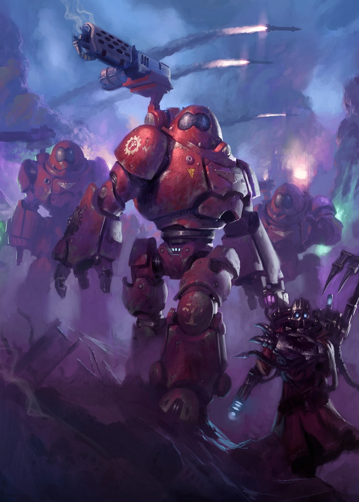 Roboty typu Kasztelan z Legio Cybertetica Belisariusa Cawla wpierają gwardzistów w podziemiach