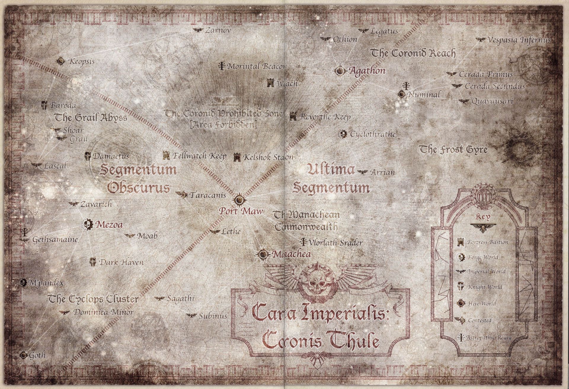 - 007-009.М31 — Манахейская война и Тёмные Согласия. Когда измена Воителя, наконец, раскрывается, он начинает безостановочное продвижение к Терре, принуждая к Тёмному Согласию бессчётные регионы всего северного Империума, чтобы обеспечить свои войска ресурсами для продолжительной и непрерывной войны. Первыми среди его целей стали Манахейское Содружество и Коронидские Глубины с прилегающими районами, где Сыны Хоруса и Гвардия Смерти проводят особо безжалостную кампанию, в результате которой экономически значимые миры Манахейского Содружества переходят во власть предателей. Более обширная война приводит под коготь Воителя и флотскую станцию Порт-Пасть, а также изолирует и блокирует упорно сопротивляющиеся миры-кузницы Люций и Мезоа, в то время как вставшая на сторону предателей мир-кузница Циклотрат начинает создавать в регионе собственную карманную империю.