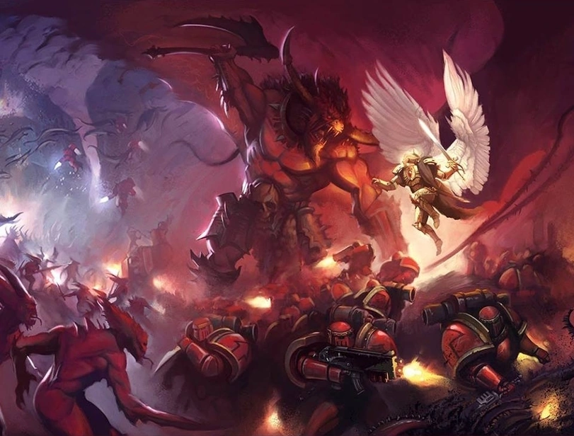 Жестокость ближнего боя была поистине феноменальной — колоссальные орды врага теснили боевые порядки IX легиона со всех сторон. Нескладные, кричащие ужасы рубили ряды Кровавых Ангелов громадными тесаками из чёрного железа, рогатые твари прыгали средь сражающихся, гогоча и убивая, в то время как исполинские раздутые монстры крушили бронетехнику и боролись с дредноутами. Многие из легионеров встретили свою смерть, но другие продолжали сражаться, медленно, но верно укрепляя свои позиции и сохраняя уверенность в возможной победе. Сангвиний наблюдал за падением бесчисленных цивилизаций и руководил истреблением опаснейших ксенорас по всей Галактике — и покуда он возглавлял легион, пока он был готов вести его вперёд, к новым триумфам и бессмертной славе, ни один легионер не сомневался в успехе их борьбы. Но затем Ангел предстал перед архидемоном, и всё изменилось.