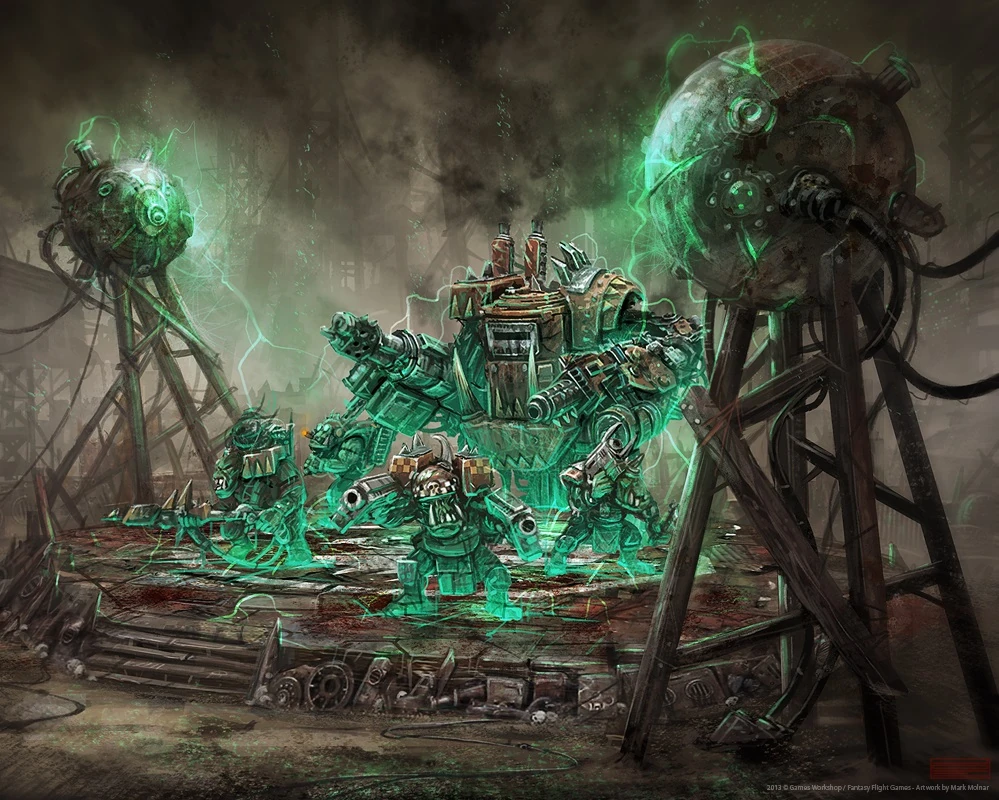 Как и в случае с любыми технологиями зеленокожих, никто не знает, как это вообще может работать. Действие теллипорты основано на превращении механической или термической энергии в психическую. Этот поток создаёт нестабильный путь в Варпе и позволяет перемещать войска на достаточно большие расстояния в обход законов физики и здравого смысла. Меки обычно производят два разных типа теллипорт. Это компактные (огромный ранец) личные теллипорты, которые могут переместить большого мека и его отряд прямо на линию фронта, и гораздо более крупные и стационарные теллипортационные платформы, способные при удачном стечении обстоятельств протащить через Имматериум боевую единицу размером со стомпу.