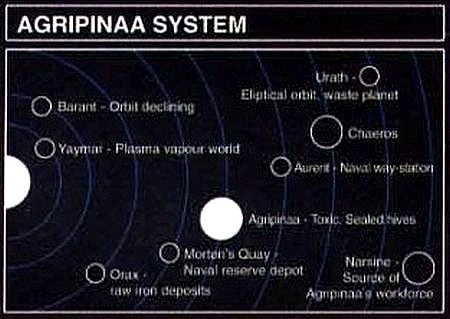 The Agripinaa System is an Imperial star system and the home solar system of the crucial Forge World of Agripinaa, located in the Agripinaa Sector of the Segmentum Obscurus, close to the Eye of Terror. It is a neighbour of the Belis Corona and Cadian Systems.