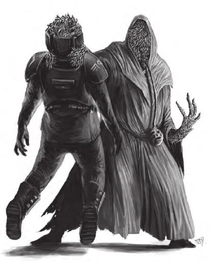 The Slaugth are terrible and monstrous beings whose minds and bodies are utterly alien and who are rightly feared and reviled by Mankind. The Slaugth (known in some cases as the "Maggot Men," the "Dream Eaters," or the "Carrion Lords") are regarded by most that have heard of them as little more than a nightmarish myth -- Voidborn tales or the dark fancy of some mad Rogue Trader. The Inquisition, for its part, knows the race to be all too real, but have suppressed all knowledge under a blanket of secrecy for millennia. The Inquisition also knows what terrible desire motivates the Slaugth's contact with humanity -- the desire to feed. They are carrion eaters and crave the flesh of dead intelligent beings above all others, savouring in particular the cranial matter from which they seem to derive an almost narcotic and addictive pleasure in consuming. Some tales even go so far as to say that the Maggot Men somehow consume the memories and knowledge of their victims this way.