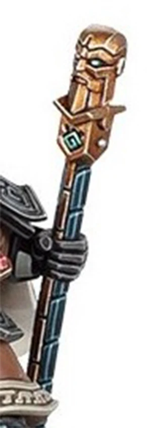 An Ancestral Warding Stave, also called an Ancestral Ward Stave, is a form of barrier-tech employed by the Grimnyr of the Leagues of Votann to unleash the power of their psychic disciplines. Barrier-tech is the name given to the advanced technology of the Leagues of Votann that allows those Kin cloned with a psychoactive cloneskein, such as the Grimnyr and the Embyr, to access and manipulate the psychic energies of the Immaterium.
