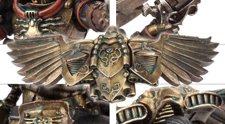 The Auramite Pinions consist of a lightweight suit of vestments which interface with the Custodian's own breastplate. The jump harness consists of hand-bonded and reinforced leather armour enhanced with auramite plating to ensure the protection of a warrior's vital organs. This harness is integrated with the sophisticated Jump Pack, which is hand-crafted into the form of the Raptor Imperialis by master artisans in the spire-tops of the Imperial Palace's Tower of Hegemon.
