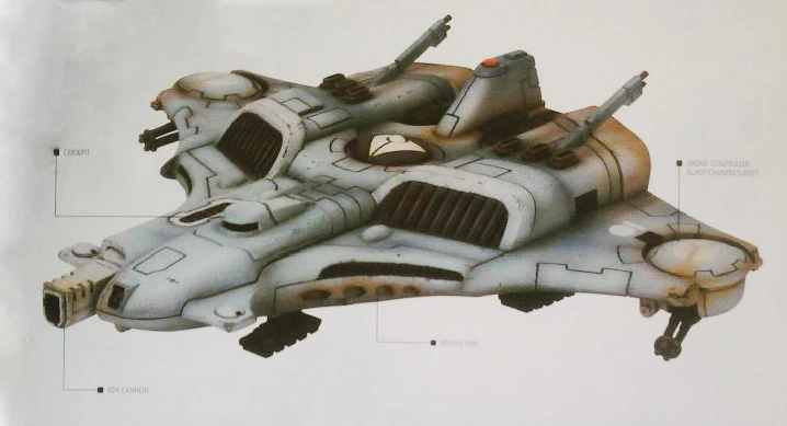 Faster than the Imperial Navy's Marauder bomber, but lacking the high maximum speed of the Thunderbolt or Lightning fighter, it makes up for this lack with its sophisticated electronic systems and the natural talents of its T'au Air Caste pilots.