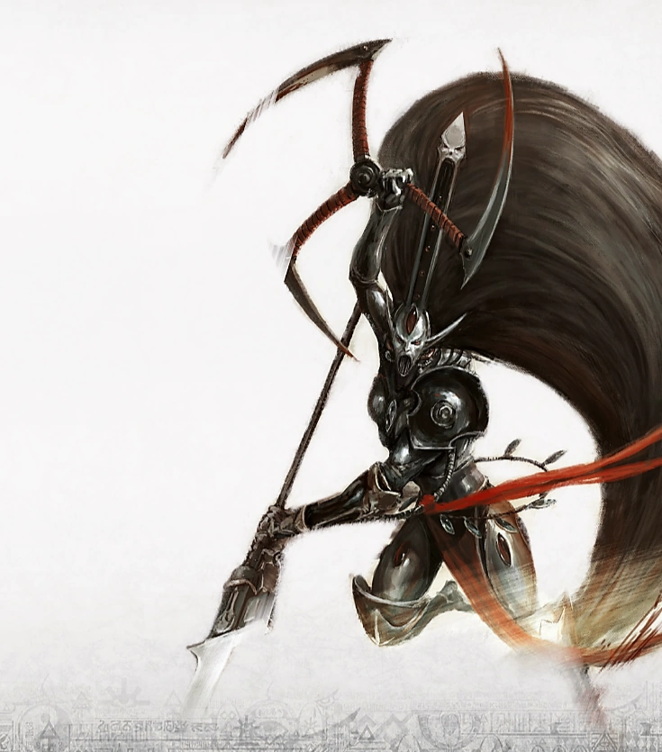 The Avatar's chamber was suddenly split by a deafening shriek. It was not the mocking cry of a daemon, but a clear and piercing scream that grew to mind-numbing volume. A towering warrior charged into the fray, long-hafted blade whipping left and right to decapitate a Daemonette with every stride. The Masque, finding her spell ineffectual on the newcomer, jumped high with claws outstretched. Up came the polearm of the newcomer, fast as thought, impaling the daemon against the iron ceiling of the throne room.