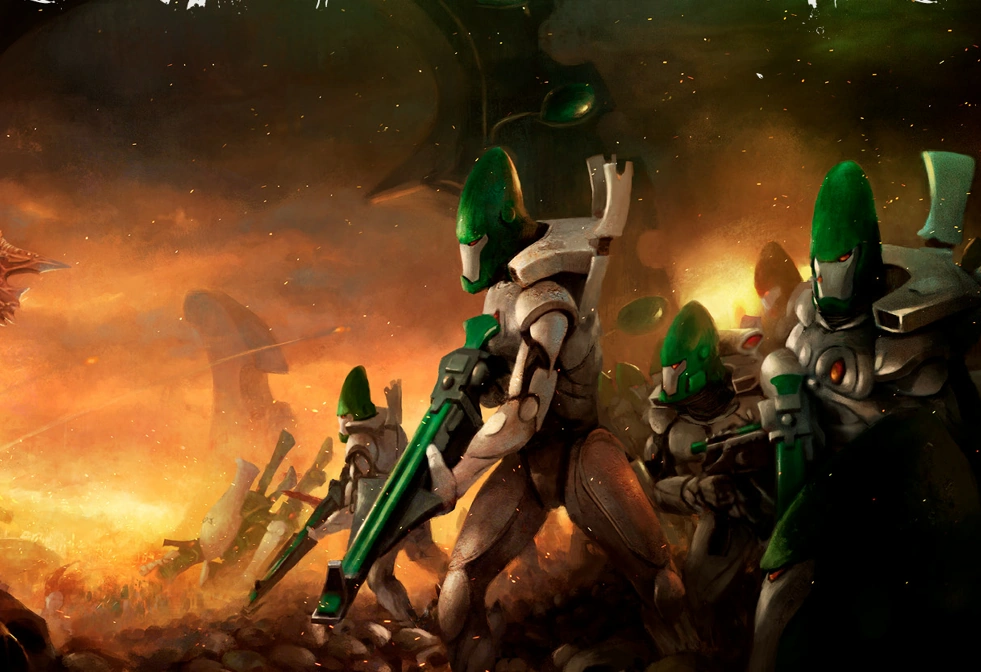The Dire Avengers were far from alone. Biel-Tan was once a highly populated craftworld, and the appearance of the god of the dead's Avatar had been a compelling sign that Yvraine spoke the truth about a new order coming into existence for the Eldar. With the Dire Avengers came warriors from every Aspect, Guardian citizens in the garb of the craftworld's militia, whole squadrons of grav-tank pilots and rank upon rank of silent Ghost Warriors.
