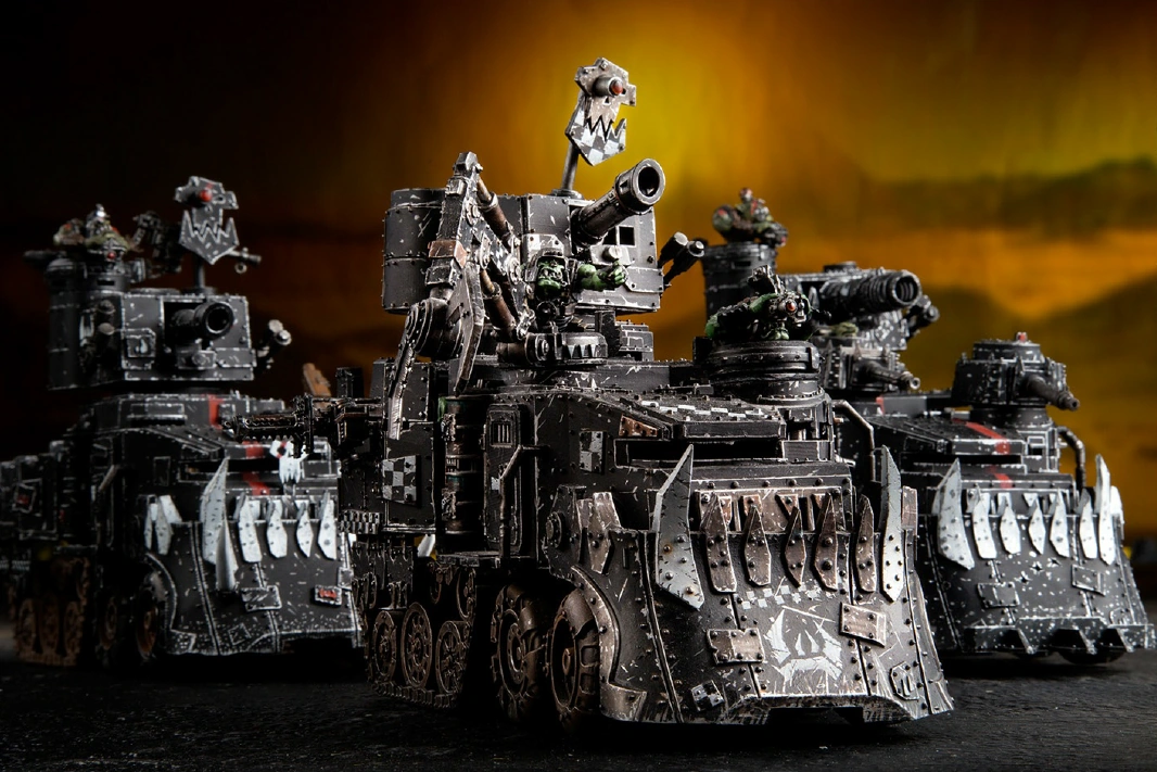 Ork Battlewagons rumble to war on a collection of tracks, tyres and massive spiked rollers. Whether lumbering gun-fortresses, bright red speedsters or gaudy rust buckets smeared with Ork glyphs, Battlewagons are massive slabs of motorised junk built to carry big mobs of Greenskins into battle. No matter a Battlewagon's individual peculiarities, all fulfil the essential role of an armoured attack vehicle for Ork forces.