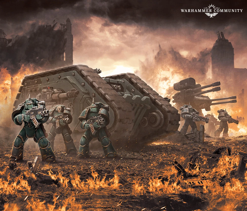 Sons of Horus Astartes infantry in Mark III Iron Power Armour armed with boltguns move forward during the final days of the Great Crusade supported by a Deredeo Pattern Dreadnought and Land Raider Proteus.