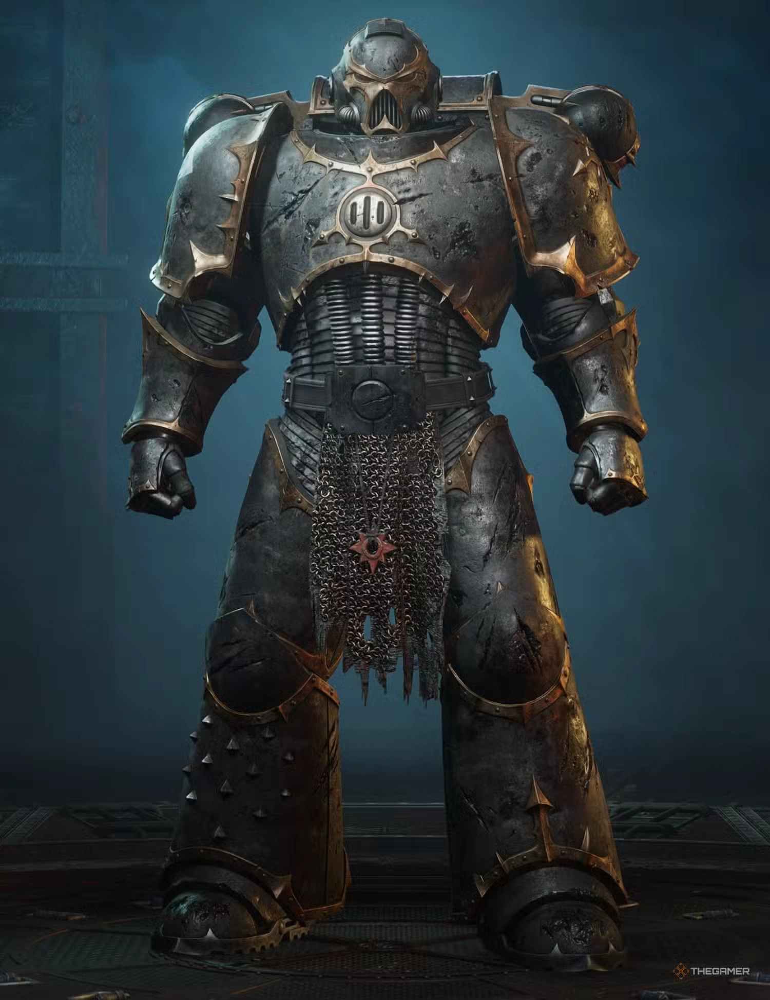 A Heretic Astartes of the Black Legion in Chaos Power Armour as depicted in Space Marine II.