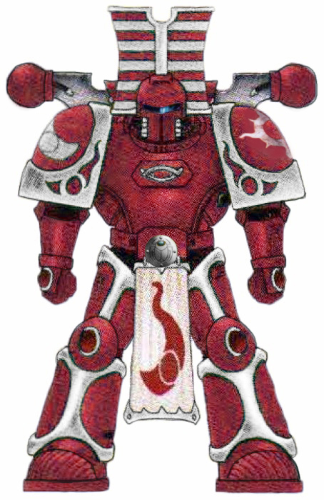 The Brotherhood of Dust wore power armour in the pre-Horus Heresy Legion colours of the Thousand Sons, favouring lacquered red with silver trim as well as ornate crests on their helmets similar to the striped cloth crowns once worn by ancient Gyptian pharaohs of Terra.