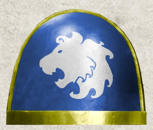 The Celestial Lions' Chapter badge is the profile of a white, roaring lion's head upon a field of azure. The lion's head is sometimes coloured gold for Astartes of the rank of Pride Leader and above.