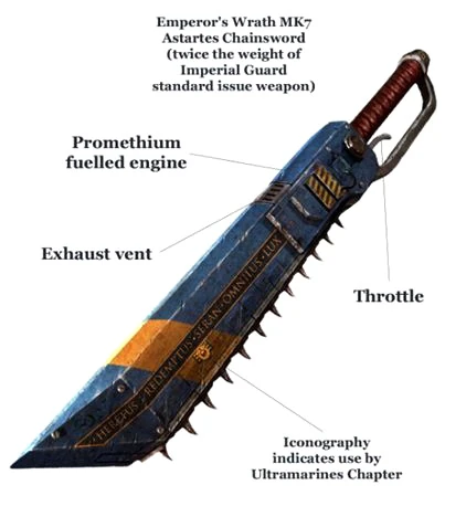 - Mark VII "Emperor's Wrath" Pattern Chainsword - A standard Adeptus Astartes pattern of chainsword often used by the Ultramarines Chapter and their successors.