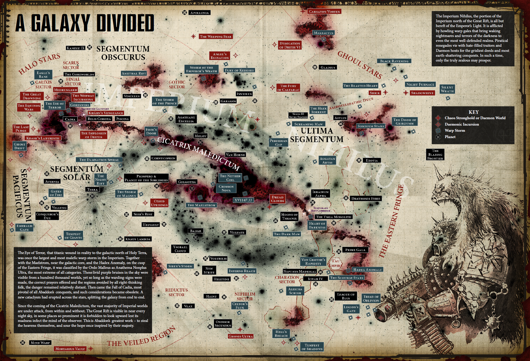 Less obvious, however, is that along that path, his actions have gradually weakened the veil between realspace and the Warp, assisting the birth of the Great Rift after the successful conquest of the Fortress World of Cadia during the 13th Black Crusade in ca. 999.M41.