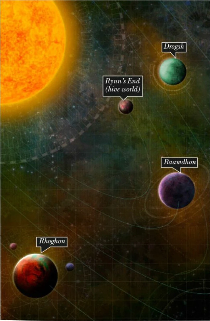 What the Imperium found was that a few of the planets still had Human populations: the outermost planet Rhoghon with its twin moons, as well as Raamdhon, Drogsh, and Rynn's End. Yet as close as these planets were to each other they had lost touch with all outside worlds.