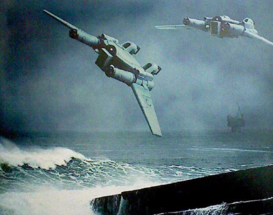 A pair of DX-6 Remoras fly over the storm-wracked seas of Typha IV