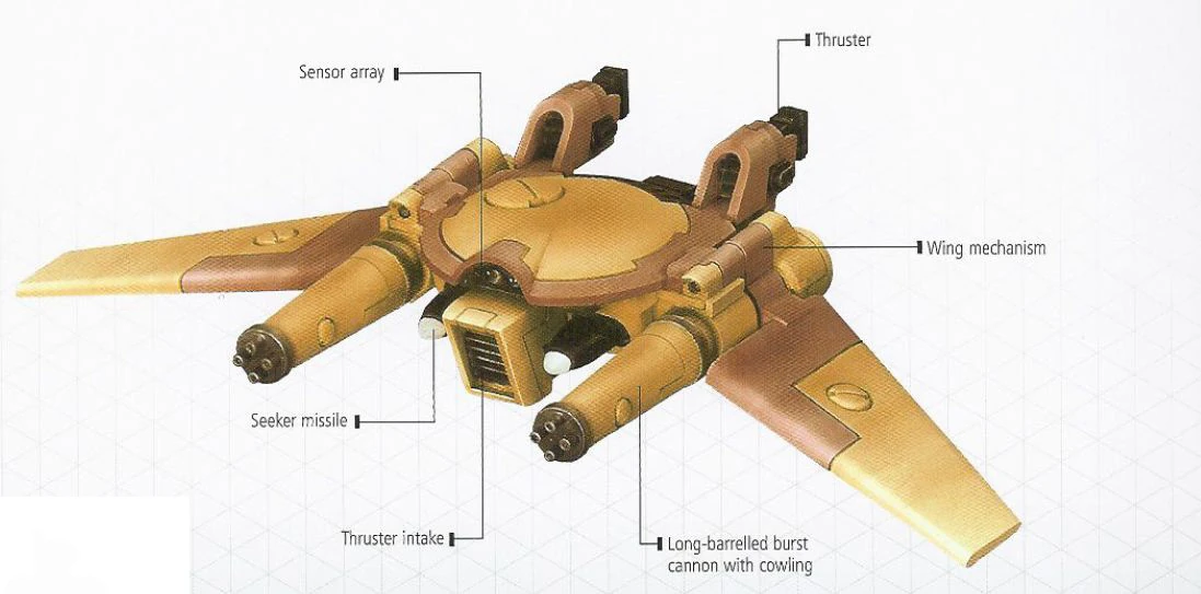 Remoras are armed with twin-linked, long-barrelled Burst Cannons as their primary armament, allowing them to target infantry from long ranges effectively. Remoras also carry two Seeker Missiles which can be fired upon targets designated by Marker Light operators on the ground, or by the Remora's own Networked Marker Light. The Remora's Seeker Missiles are most effective against light to medium armoured targets as the Remora's speed allows it to move into positions where its Seeker Missiles can strike the more vulnerable side or rear armour of vehicles. Remoras are equipped with a Targeting Array and Blacksun Filter as standard. The Targeting Array increases the accuracy of the Remora when firing its Burst Cannons and Networked Marker Light, whilst the Blacksun Filter utilises its optical filters to give the Drone fighter better combat effectiveness in low-light conditions and darkness. Remoras are also equipped with the same stealth field technology used by XV15 and XV25 Stealthsuits. This allows the Remora to hide itself from enemy sensors and also become all but invisible once the field is activated. It is because of this stealth field capability that Remoras are a valuable tool in scouting and ambushing enemy forces whilst remaining unseen.