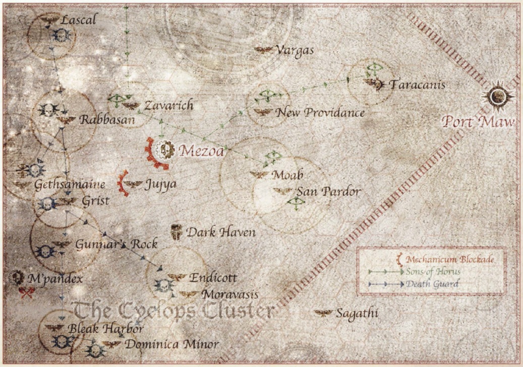 The shadowed world was at the very edge of its aged star's habitable zone, and life there had flourished millions of standard years before it ever had on distant Terra. Here the dominant form of that life was akin to fungi, but infinitely more varied and complex than that of most worlds, forming a planet-spanning web of life. Its patterns varied, from towering pseudo-coral-like structures kilometres high, comprising billions of microscopic creatures, which overshadowed the land and covered the seas, stealing the light, to colossal, ambulatory predators whose venom could sear ceramite and eat through plasteel. All of it was to Humanity virulently and fatally toxic when consumed, even given the most stringent methods available for its processing. Dark Haven was a Death World, misjudged as a paradise of life.