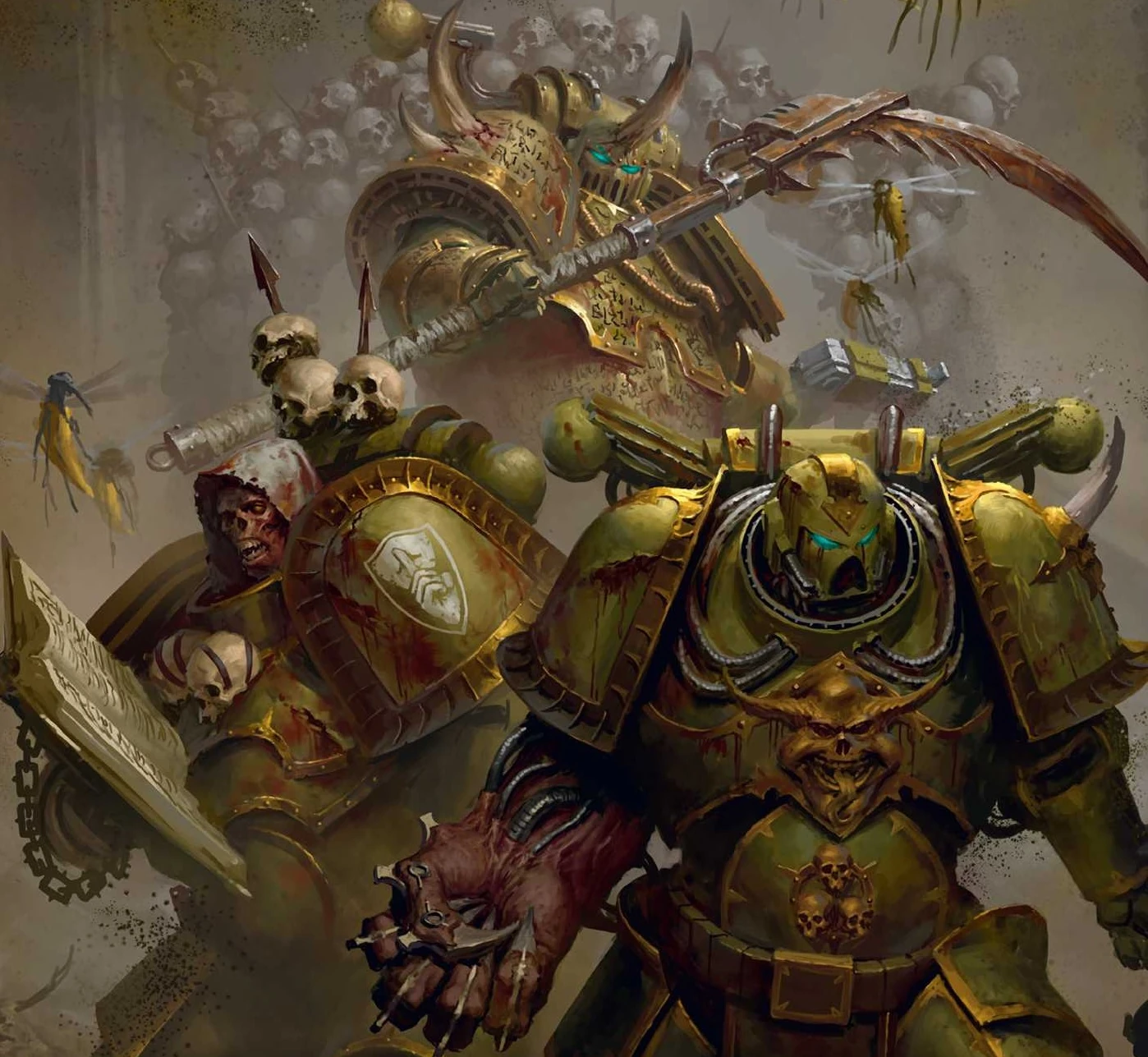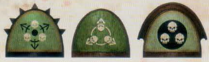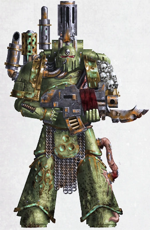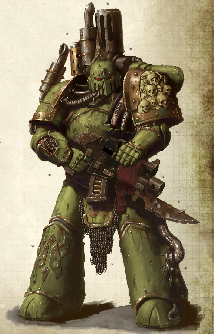 Post-Heresy Death Guard iconography; the triple skulls echo the sigil of their patron Chaos God, Nurgle.
