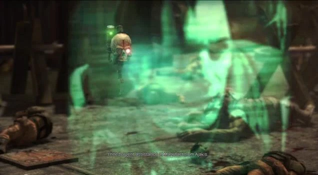 Captain Demetrian Titus of the Ultramarines sees a hololith of Inquisitor Drogan projected by his Servo-skull on Graia before his Daemonic possession.