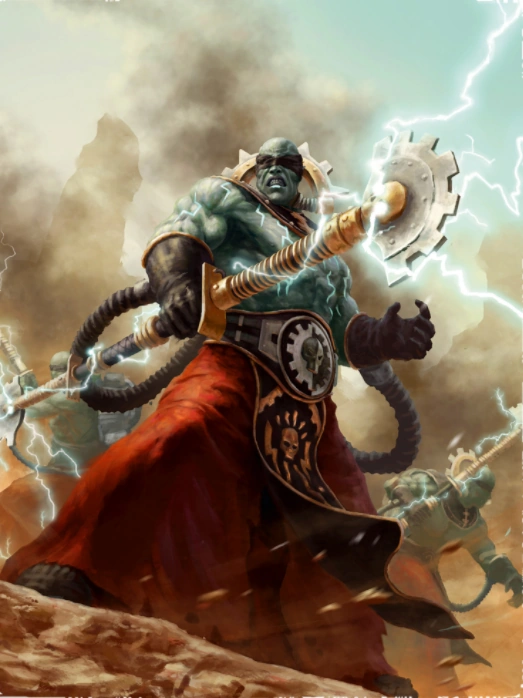 Fulgurite Electro-priests crackle with energies stolen from those they slay in mortal combat. A protective shroud of lightning known as a "Voltagheist Field" surrounds them, and their rewired veins and subcutaneous electoo circuits thrum with divine force. The Fulgurites are amongst the most blunt and bellicose of the Omnissiah's disciples -- these holy warriors do not slay their foes at range, but bludgeon the life from Heretic and foe-machine alike.