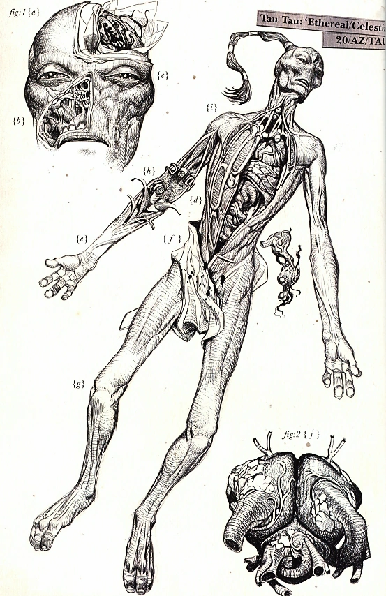 Dissection of a female Ethereal by an Imperial Magos Biologis; letters correspond to text at left.