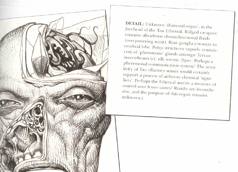 Skull Detail: Unknown "diamond-organ" in the forehead of the T'au Ethereal. Ridged carapace contains ultradense chemo/hormonal fluids (overpowering scent). Rear ganglia connects to cerebral lobe. Polyp-structures vaguely reminiscent of "pheromone" glands found amongst Terran invertebrates (cf. silk worm). (Speculation: Perhaps a pheromonal communication system? The sensitivity of T'au olfactory senses would certainly support a process of airborne biochemical "signifiers." Perhaps the Ethereal asserts a measure of control over lesser castes? Results are inconclusive, and the purpose of this organ remains unknown.)