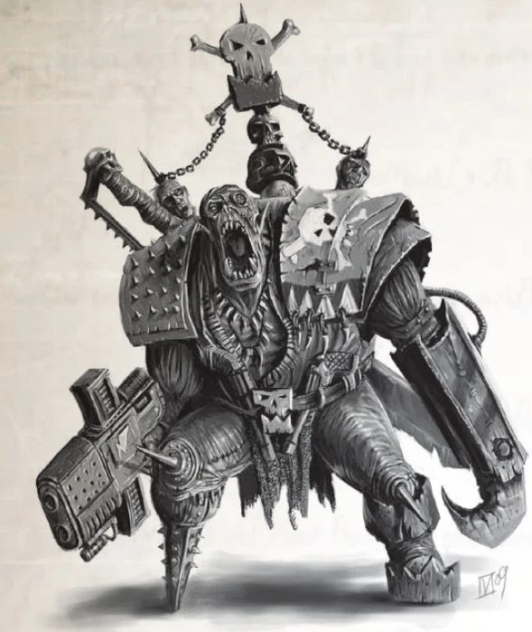 - Mogdos Gilt-Toof - Said to be the richest Ork in all Charadon, Mogdos' deep coffers of teef are vast enough to pay for the services of the best Big Meks and Painboyz around. Once, he was a mere fang-ripper from a Bad Moons scrap fleet that was following in the shadow of a tendril of Hive Fleet Leviathan. The Ork vessels were scavenging the Dead Worlds that the forward elements of the Tyranids had attacked, before the bio-ships stripped the worlds completely. All was going well until the crews of the scrap fleet disturbed a dormant nest of bio-horrors on a dead Human factory world. Mogdos was the only Nob to make it back to the fleet alive after the ensuing battle, and "inherited" its wealth, setting up base in the nearby Ork Empire of Charadon and throwing in his lot with the Arch-arsonist Snagrod. Since then, Mogdos has followed Snagrod on his rampage across the Ultima Segmentum, making sure the other warbosses pay their due and commissioning Meks to build the biggest and best war machines. For this reason, the Arch-arsonist keeps the Bad Moon and his Boyz around, their flashy wagons and Mogdos' golden grin a prominent fixture in the WAAAGH!. Mogdos' reputation also extends beyond the reaches of the Charadon empire, and stories tell of how, when he filled his first voidship full of teef, he hid most of it. This legend of Gilt-Toof's treasure is told, in the main, by grizzled old Freebooterz, and has inspired many a greedy warband of Orks to wander off into the void looking for it, raiding worlds, and terrorising local populations in their quest for the alleged cave full of teef. However, the Freebooterz's stories contradict each other, each one giving different clues to the planet's location, ensuring the legend of Gilt-Toof's hidden hoard continues to remain a mystery.