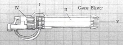 Unlike more conventional directed energy weapons, a Gauss Blaster does not deliver a cutting beam or pure bolt of electromagnetic force or subatomic particles. Instead it emits an emerald, lightning-like molecular disassembling beam capable of reducing flesh, armour and bone to almost nothing. It is, supposedly, extremely painful to be shot with a Gauss Blaster, and victims die as much from the systemic shock of the assault as the damage caused by the beams.
