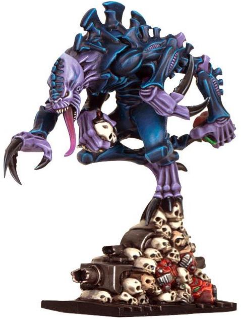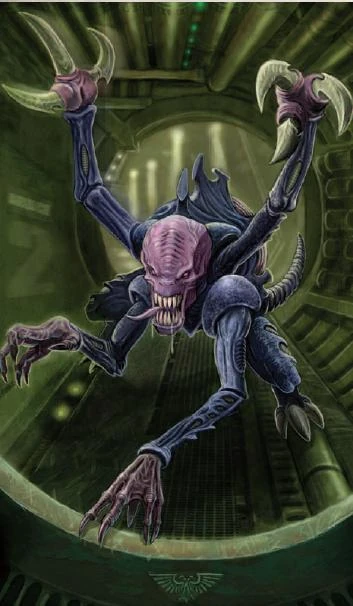 Isolated broods of this Tyranid creature are typified by a blue-indigo coloration. Such beasts have been encountered not only on numerous Space Hulks, notably the Sin of Damnation, but also upon the moons of Ymgarl, once thought home to a tentacle-mawed variation of the xenoform. This strain is possibly specifically nomadic; bio-engineered purely to infect new hosts.