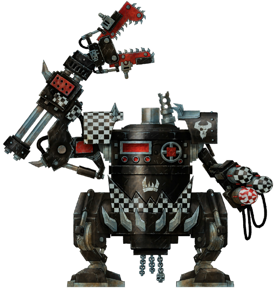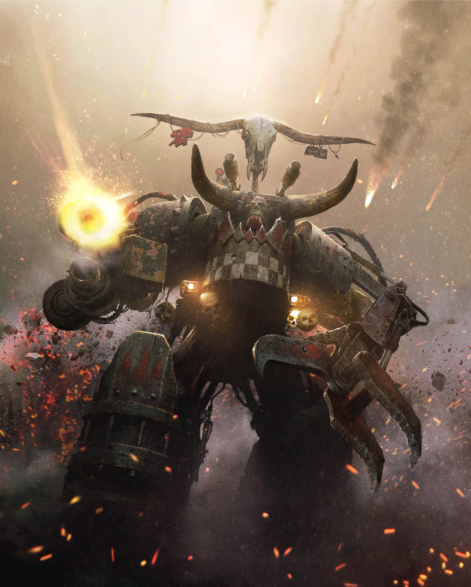 Clanking forward, these iron-plated tank-killers strode through the shellstorm. A land armada of Deff Dreads, Killa Kans and hulking Morkanauts lurched into the enemy armour formations. Explosions lit up the plains as Power Klaws wrenched off turrets. Buzzsaw arms reached in to savage the exposed crew, and the screams of the eviscerated victims were music to the Orks' ears. With the foes' tanks reduced to smoking wreckage, the Stompas and Deff Dreads used their firepower to tip the scales on the evenly matched duel between the Gargants and the Titans. Towering mushroom clouds rose from the destroyed Imperial Titans, and the concussive blasts of their detonations slew many Orks, but when the shockwaves ceased, the green tide flowed over the enormous craters.