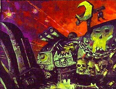It was Mad Dok Grotsnik who led a charge to win the landing bays of what must have been an old Imperial transport. The landing craft berthed within were still occupied by the skeletons of their long-dead pilots. The few landing craft that were still operational were commandeered to aid the transport efforts. It was Ugrak's Uglies -– the Goff Nobz Mob –- that fought their way into the asteroid embedded deep within the space hulk. There, in magma-worn tunnels, they pitted Power Klaws against Hellblades, and in the end only Ugrak's Kombi-skorcha swept the path clear. In the larger holds, Battlewagons lowered their deff rollas to mash all opposition, before being countered by Soul Grinders -- hulking Daemon Engines whose metal claws shredded the Ork vehicles. Soon, Ork Tankbustas were hunting the Soul Grinders, crawling through air vents to send rokkits corkscrewing into their unnatural foes, blowing them apart in sprays of flame and ichor. Behind the front waves of fighting came the Meks, welding over patches, re-sealing airlocks and repairing their battered engines of war.