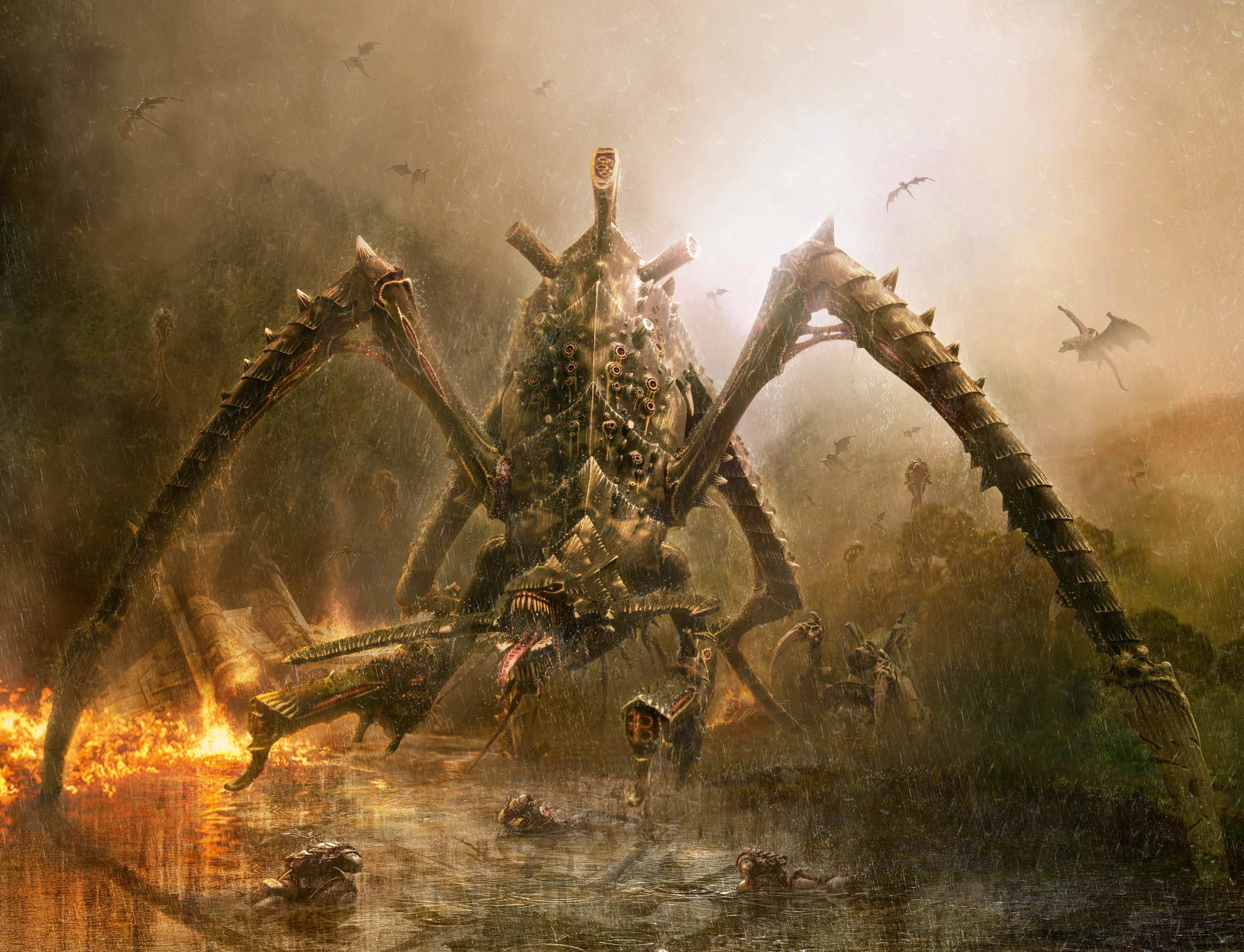 The Hierophant also has one last line of defence. From rends in its armour plates and body the Hierophant constantly exudes a cloud of highly toxic poisonous spores. These are lethal to all non-Tyranid creatures, forming a drifting vapour about the Hierophant that chokes and burns the lungs of anyone without the proper protection that is brave enough to get close to the monstrous Bio-Titan.