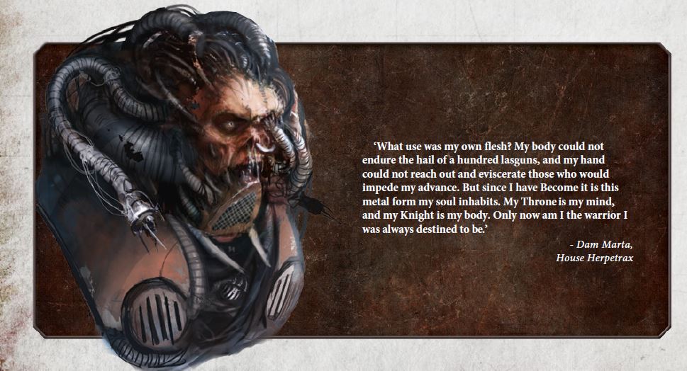 - Dam Marta - The Chaos Knight Eternal Dread has long served as the harbinger of destruction for the lances of House Herpetrax. Piloted by Dam Marta, it has marched at the fore of numerous wars of conquest, and in single combat has personally bested at least a dozen Imperial Knights that tried to bar its advance. Though the Knight Desecrator has been badly damaged on numerous battlefields, the grim tenacity of both it and its bloodthirsty pilot have seen it continue to blast its enemies apart despite seemingly crippling wounds. Dam Marta is famed amongst the Fallen Nobles of Herpetrax, for she was the first aspirant in centuries to successfully bond with Eternal Dread’s Throne Mechanicum. The process took a full Jedathran month, during which time she managed to subdue the electro-gheists that had consumed the souls of so many before her. Yet this process and exposure to the Knight's inherent Chaos energies left her permanently fused to the Throne. With her skin melded to the surrounding metal, she is able to feel -- and indeed, relish -- the sensation of every blow that lands upon her Knight.