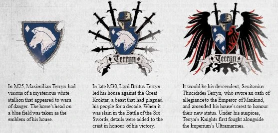 Later, when High King Seuitonius Terryn swore allegiance to the Imperium of Man, the crest was marshalled, with the half-Aquila falling on the right side, and resplendent eagle wings as supporters. This half-and-half icon shows the observer the relationship between the knightly house and the Imperium, and the dichotomy of the Terryn Knights' loyalty to their house and the wider Imperium.