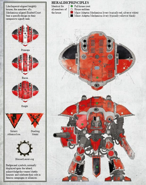 Like the knightly houses of the Questor Imperialis, the members of a Questor Mechanicus house's Exalted Court bear a specific design on their carapace to signify rank. Although houses dedicated to the service of the Machine God are less predisposed to tolerate personal heraldry than those who serve the Emperor directly, this does not, however, preclude individual differences. A Questor Mechanicus house's Barons Prime each sport a specific design commensurate with their rank on their tilting plate, displayed behind their house's icon.